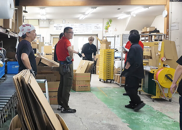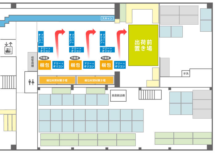 メインとなる検品・梱包作業台の配置変更はもちろん、資材の置き場やスタッフの立ち位置まで緻密に計算し直していただきました。